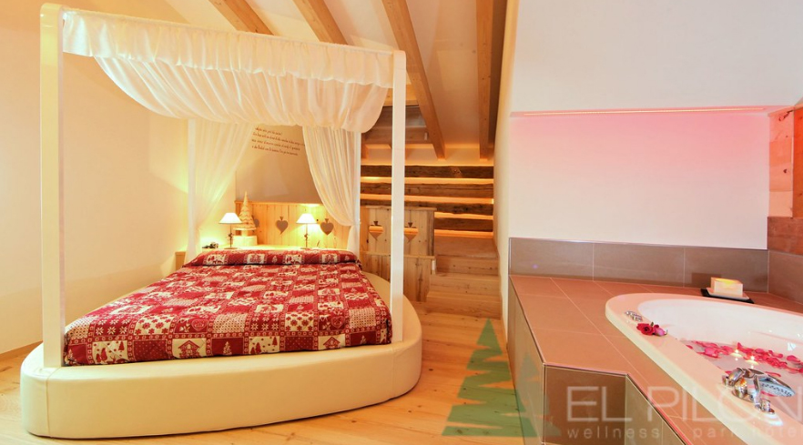 L’atmosfera di questa elegante bio-suite si percepisce fin dall’ingresso: mobili realizzati in abete antico, pavimenti in abete massiccio e la stessa struttura costruttiva in legno trasmettono il calore tipico della “stua ladina”.